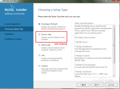 然后开始安装,接下来,我主要会说几个关键的步骤:打开安装界面后点击(License Agreement界面)I acdept the license terms-->Next,进入choosing a Setup Type界面,选择Server only-->Nex,如下图: