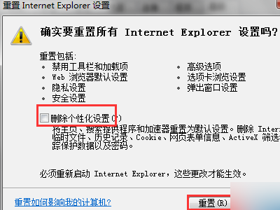 5、点击重置按钮就弹出一个窗口,进入下一个界面,这里可以勾选“删除个性化设置”也可以不勾选,选择好了,点击“重置”就可以了。