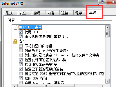 3、选择“Internet选项”后,弹出一个窗口,选择这里的“高级”即可,如下图。