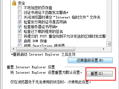 4、在“高级”页里面有“重置”按钮,这里点击“重置”即可(重置的时候把多余的网页关闭)。