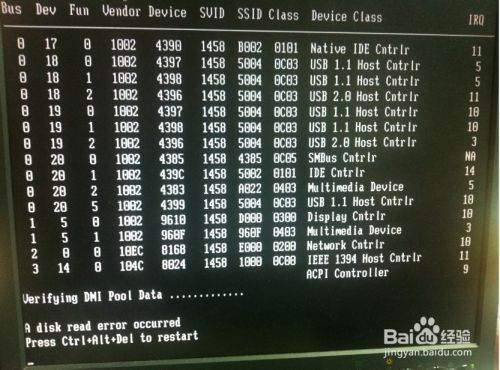 盘读取错误,按Ctrl+Alt+Del重启。引起这个问题的原因有很多: 1. 检查软驱中是否有软盘,然后进BIOS,把启动顺序调解为A在最后,顺便把A给关闭了。 2. BIOS设置中将“防病毒保护”设为启用。如果是这个原因,进BIOS,关闭“防病毒保护”。 3. 写引导区错误。将BIOS恢复成默认,再重新插拔一下光驱数据线,或者换一条光驱数据线。 4. 硬盘出现问题。问题一般出在硬盘连接线和硬盘坏道上。如果是出在连接线上,更换连接线即可解决。如果是硬盘出现坏道,可以试着用修复软件修复一下。如果坏道无法修复,也无法使用FBDISK分区软件对硬盘重新分区,那就只能更换硬盘。 5. 系统问题。用系统电脑无法使用,一直显示磁盘读取错误按Ctrl+Alt+Del重新启动?