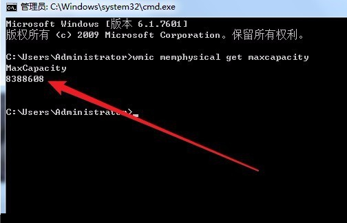 4、按下回车键后,就可以查看到当前主板支持的最大内存数了,比如这台电脑为8388608,这个是字节数,还需要进一步的运算转换成GB。
