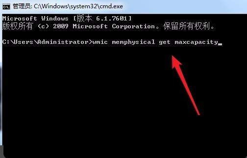 3、在接下来打开的命令提示符窗口中,输入命令“wmic memphysical get maxcapacity”。