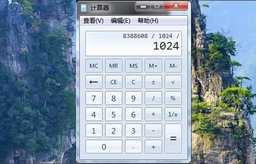 6、这时会打开Windows的计算器窗口,在这里输入8388608/1024/1024,得出结果为8G。
