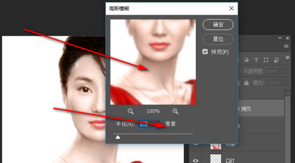 6、在选择菜单中选择“高斯模糊”,如下图,设定为1.2像素。