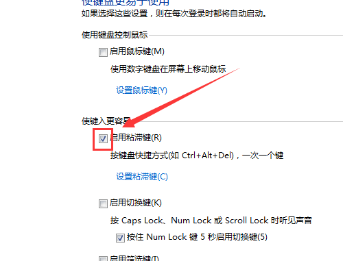 三、 在该窗口中找到“启用粘滞键”,点击取消前面的“勾”。