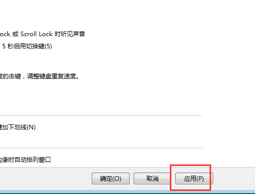 四、最后点击该窗口右下角的“应用”即可关闭掉粘滞键(注意事项:当键盘上的“Shift键”在短时间内连续按下五次时,会开启粘滞键,开启时会有一个清脆的声音提示,当出现这种情况时可根据上面步骤关闭粘滞键即可)。