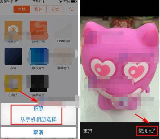 2、选择照片来源,拍摄或者在相册选取一张你要做键盘壁纸的图片,点击右下角【使用照片】。(如下图)
