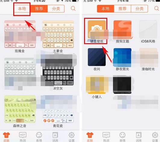 1、打开搜狗输入法应用,进入默认皮肤页面,接着点击上方【本地】。选择【键盘壁纸】。(如下图)