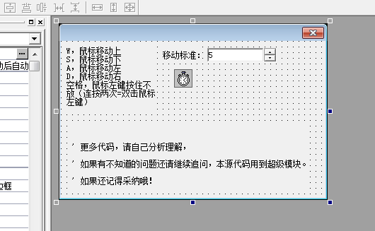 x是横坐标,y是纵坐标 .版本 2.子程序 __启动窗口_创建完毕监视热键 (&鼠标, #F8键) .子程序 鼠标 .局部变量 x, 整数型 .局部变量 y, 整数型x = 0 y = 0 鼠标移动 (, x, y)易语言键盘控制鼠标拖拽功能