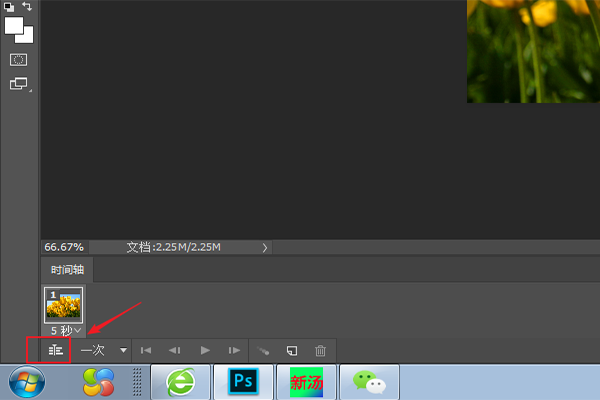 4、时间轴分为视频时间轴和帧动画轴,选择左下角一次旁边的符号可以转换为视频时间轴。