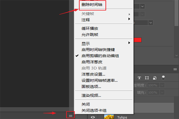 5、如果要恢复到PS的初始状态,可以点击视频时间轴右边的三个横线,在弹出的选项选择删除时间轴