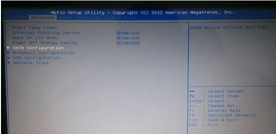 一、 重启电脑,在出现电脑画面时按下对应快捷键进入bios,通常进入bios的快捷键有del、f2与f1三个,在用户不知如何进入bios时可使用这些按键尝试进入。在进入bios界面中,使用键盘上的左右键方向键选择Advanced,接着选择SATA Configuration