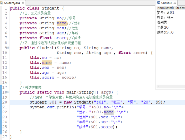 Student S01 = new Student("s01", "张三", "男", "20", 99);