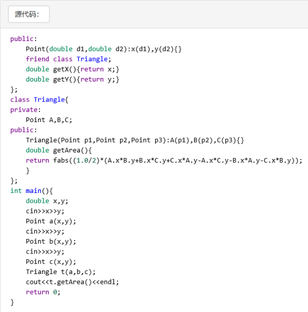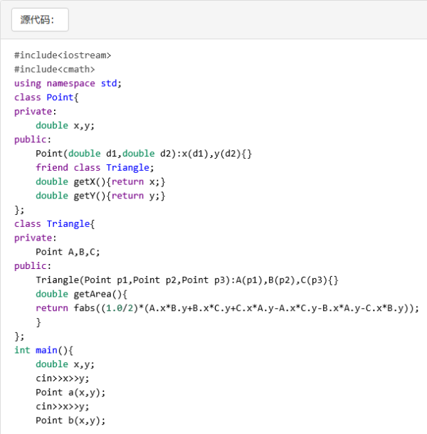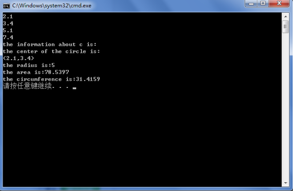 cout<<"("< } //POINT类实现完成 classCIRCLE:publicPOINT { private: constdoublePI;//常数据成员,值为3.14159 POINTr1,r2;//两个对象成员,r1表示圆心,r1和r2有距离作为半径 doubler;//表示圆的半径 public: CIRCLE(POINTp1,POINTp2); doublecircum(); doublearea(); voidshow(); }; //实现CIRCLE类的构造函数 CIRCLE::CIRCLE(POINTp1,POINTp2):r1(p1),r2(p2),PI(3.14159) { r=sqrt(pow((r1.getX()-r2.getX()),2)+pow((r1.getY()-r2.getY()),2)); } // voidCIRCLE::show() { cout<<"thecenterofthecircleis:\n"; r1.show(); cout<<"theradiusis:"< cout<<"theareais:"< cout<<"thecircumferenceis:"< } //实现CIRCLE类的circum和area方法 doubleCIRCLE::circum() { return2*PI*r; } doubleCIRCLE::area() { returnPI*r*r; } // intmain() { doublex[4]; inti; for(i=0;i<4;i++) cin>>x[i];//点的横纵坐标由输入给定 POINTp1(x[0],x[1]),p2(x[2],x[3]); CIRCLEc(p1,p2); cout<<"theinformationaboutcis:\n"; c.show(); return0; } 调试结果: 按照题目要求编写的完整的C++语言程序如下 #include #include using namespace std; class Point{ private: double x,y; public: Point(double d1,double d2):x(d1),y(d2){} friend class Triangle; double getX(){return x;} double getY(){return y;} }; class Triangle{ private: Point A,B,C; public: Triangle(Point p1,Point p2,Point p3):A(p1),B(p2),C(p3){} double getArea(){ return fabs((1.0/2)*(A.x*B.y+B.x*C.y+C.x*A.y-A.x*C.y-B.x*A.y-C.x*B.y)); } }; int main(){ double x,y; cin>>x>>y; Point a(x,y); cin>>x>>y; Point b(x,y); cin>>x>>y; Point c(x,y); Triangle t(a,b,c); cout< return 0; } Point类 测试类 相关文章 怎么使用wps里的朗读功能建一个演示文稿,把幻灯片版式设为只有标题版式,在文本框里输入文字,再选中文字,点击“特色功能→朗读→当页朗读”,这时候会弹出一个对话框,要求登录,登录 如何用JAVA实现字符串简单加密解密?java加密字符串可以使用des加密算法,实例如下: package test; import java.io.FileInputStream; import java.io.FileOutputStream; import 编写一个程序,把片内RAM从30H开始存放的16个数据传送到片外RAM从0000H开始的单元中。1、首先在采用CCS6.0编译器进行代码编写时,要进行相应的设置,如下图所示。2、其中,外扩接在 电梯广告三大梯媒有什么优势?三大梯媒喜屏传媒友情分享电梯广告的优势有以下几点: 一、重复关注 电梯广告存在于人们生活固定轨迹,每天上下电梯都会反复接触,出门第一眼看到的,回 自定义水印相机如何修改水印信息?马克水印相机的话,直接点击水印就可以进入编辑页面啦,除了时间地点不能篡改之外,其他信息可以根据实际情况来编辑和修改。如果您满意,求给大大的 B语言和C语言 有什么区别(越详细越好)不知道或者没听说过B语言的请不要凭着自己的感觉胡乱回答,误人子弟。 B语言是贝尔实验室开发的一种通用的程序设计语言,它是于1969年前后 请问一下这个C语言编程题怎么做(对于稍微有点基础人的来说很简单),很急,谢谢!!第一题(用数组编程)随机产生10个30~100(包括30,100)的正整数,求最大值,最小值,平均值,并显示整个数组的值和 现在学互联网技术还有前途吗?计算机的就业趋势 从总体上讲,社会对计算机人才总需求量有明显变化,但毕业生就业岗位分布和岗位层次将更加宽泛,需求的主体由政府机关、金融单位、 使用一维数组,函数编写程序,从键盘输入8个整数,然后输出最大数和最小数.intmain()