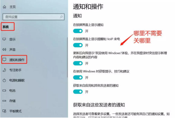 在【设置】-【系统】-【通知和操作】,就可以选择关闭“显示有关Windows的提示”。