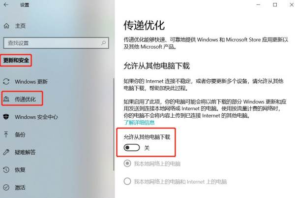 打开【Windows设置】→【更新与安全】→【Windows 更新】→【传递优化】,将“允许从其他电脑下载”关闭即可。