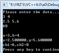 printf("\na=%d,b=%d\nx=%f,y=%f\nch1=%c,ch2=%c\n",a,b,x,y,ch1,ch2);