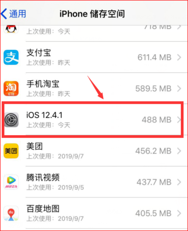 4、进入iPhone存储空间,找到系统iOS12.4.1,然后点击进入;