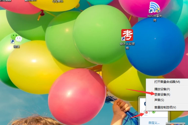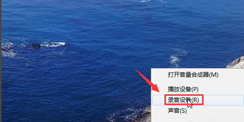 1、首先显示桌面,在桌面的左下角显示时间的地方有个小喇叭图标,点击一下鼠标右键,在弹出的新的小窗口中选择“录音设备”。