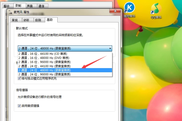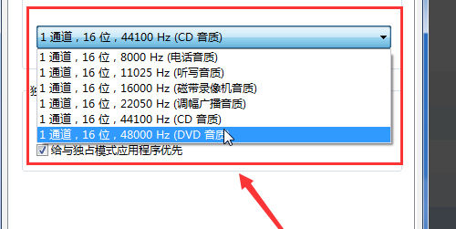 4、看到“高级”选项中有一个“默认格式”,下拉列表框,选择相应的通道进行调试并应用,选择完成过后点击“确定”。