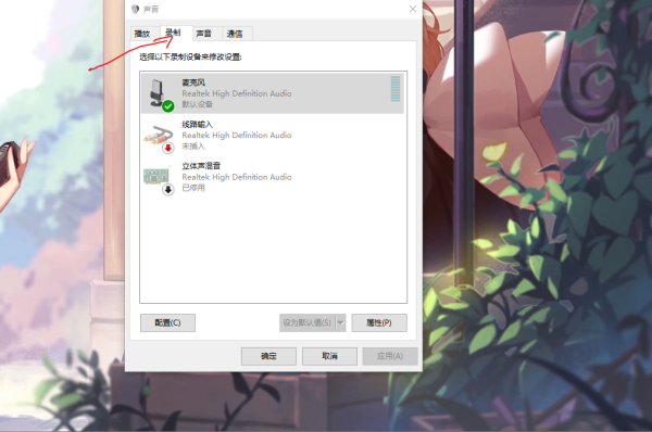 2、进入录音设备界面后,鼠标点击打开声音窗口。