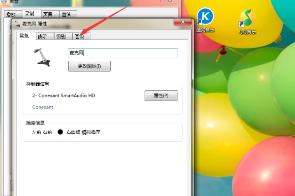 3、下一步,会看到有一个:“麦克风属性”设置的菜单。在上栏菜单那里找到高级,选择这个选项。