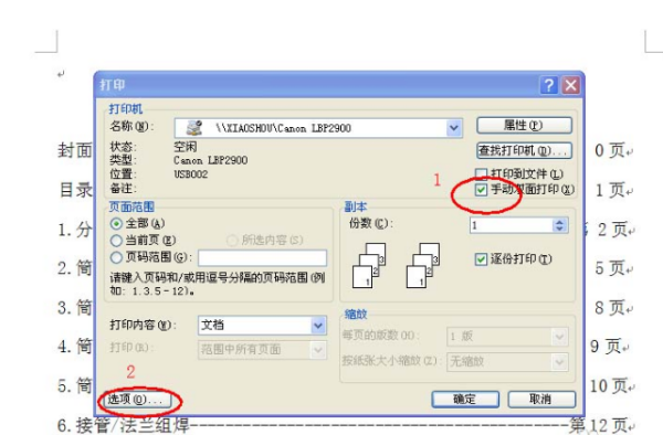 1、将要打印的文档选择文件--打印--出现打印界面,选择手动双面打印。点击选项。