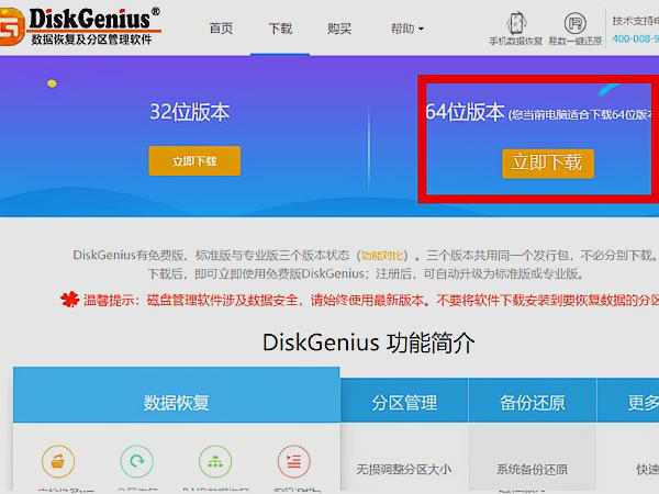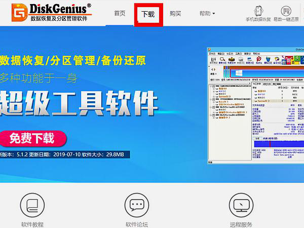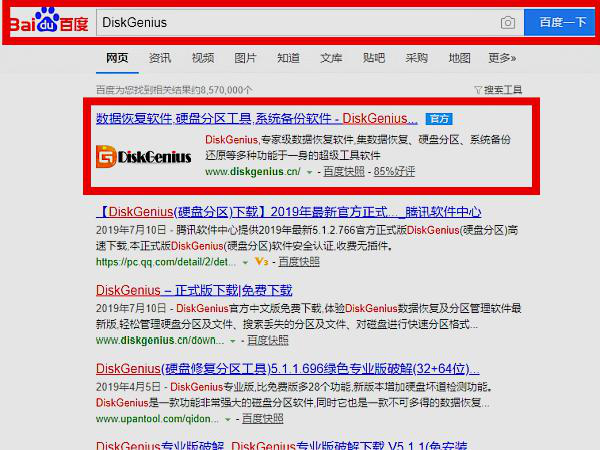 1、 第一步,通过百度搜索【DiskGenius】并点击进入第一个链接。请参考下图进行操作: