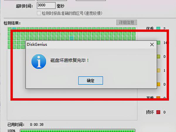 6、最后。等待软件完成后,再次点击检测按钮,会发现硬盘的损坏已经修复。请参考下图进行操作: