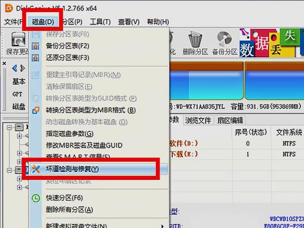 4、然后,打开下载按钮,点击软件左上角的磁盘选项,点击出现的子菜单中的【坏道检测与修复窗口】按钮。请参考下图进行操作:
