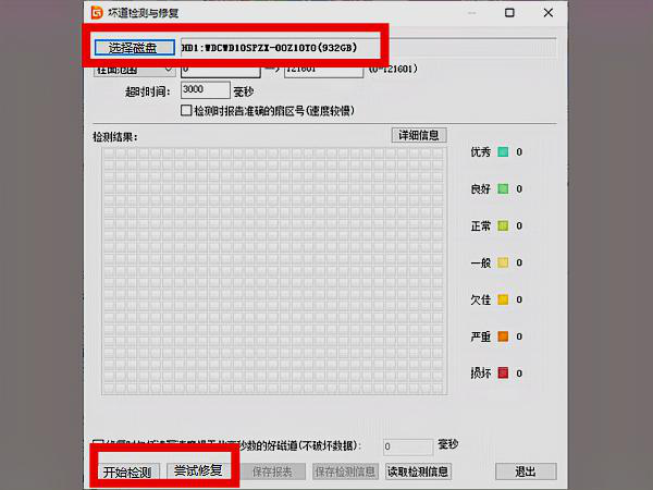 5、继续,在【坏道检测与修复窗口】窗口中,点击左上角的“选择磁盘”按钮,选择要修复的磁盘字符。点击窗口左下角的开始检测并尝试修复按钮,软件会自动检测并修复坏盘。请参考下图进行操