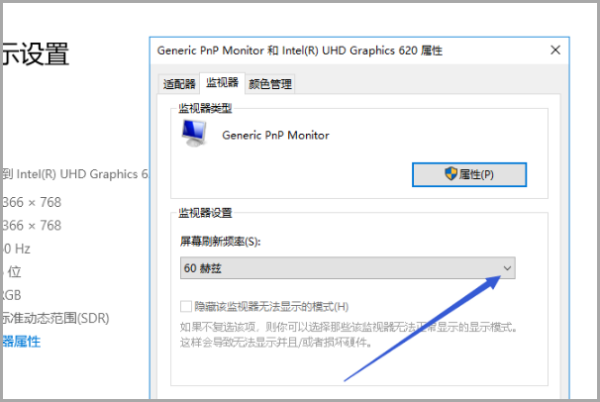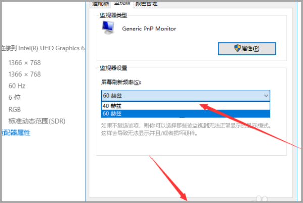 5、在打开的“即插即用监视器与...”窗口中,看到原来刷新率设置为60赫兹。