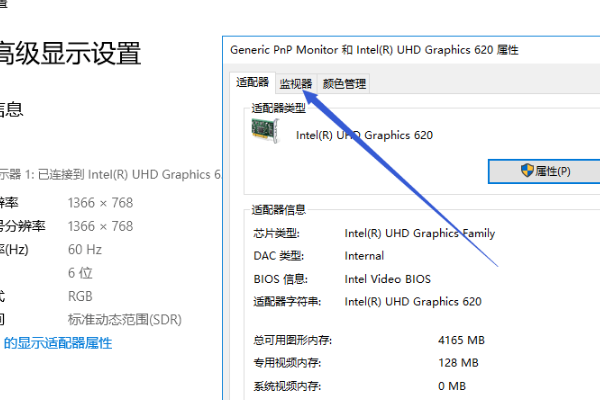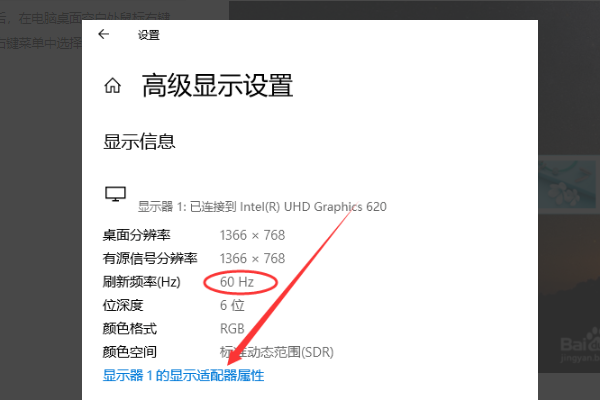 3、显示高级显示设置中的内容,默认的刷新频率是60Hz,若要修改点击底部的显示器1的显示适配器属性按钮。