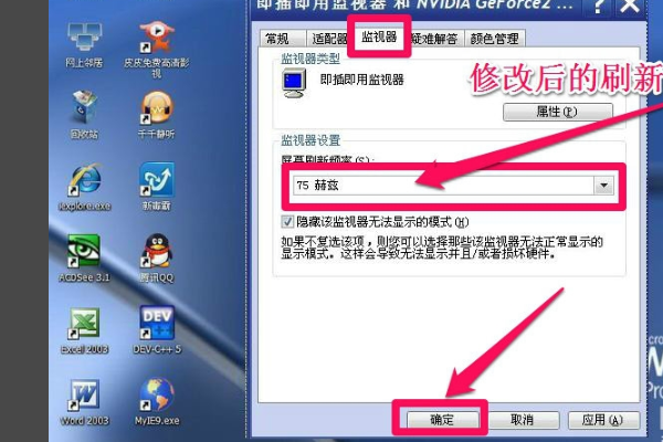 6、把“60赫兹”改为“75赫兹”,最后按“确定”,屏幕刷新频率就设置完成了。