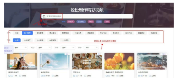 打开模板页面浏览喜欢的模板,可以在搜索框进行关键词的搜索,也可以根据细分的场景分类迅速找到相关场景模板。