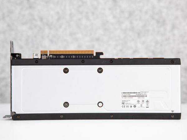 显卡的背面采用整块的铝合金背板设计,非常的简洁大气,同时稳固性很好,能够很好地保护PCB板不会变形弯曲,同时这次AMD的公版在堆料方面同样毫不吝啬,10层PCB板,保证显卡的做工。