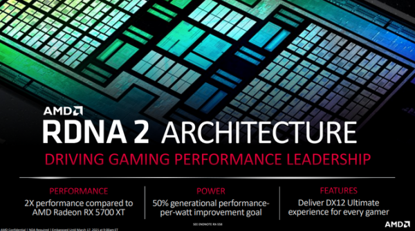 首先我们先来看一下AMD最新引以为傲的RDNA2显卡架构,全新的RDNA2架构相对于上代RX 5000显卡,性能提升超过2倍,同时每瓦性能功耗相对上代减少50%,这样的提升,相对于上代RDNA架构的显卡来讲非常巨大,这对于芯片内部架构的设计挑战非常大,在近几年的显卡市场中,这样的大幅的性能升级,几乎是没有出现过的,从这里可以看出 RDNA2架构方面的领先,而全新的AMD RX 6700XT同样采用了最新的RDNA2架构。