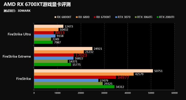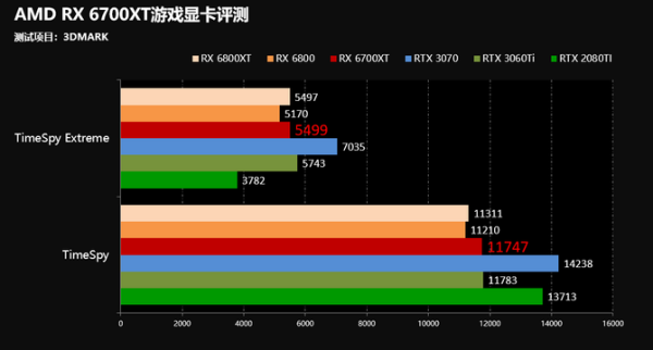 另外,TimeSpy项目中,也就是我们经常说的DX12性能,AMD RX 6700XT的性能表现同样较为优秀,在TimeSpy项目中,AMD RX 6700XT性能和RTX 3060Ti基本持平。