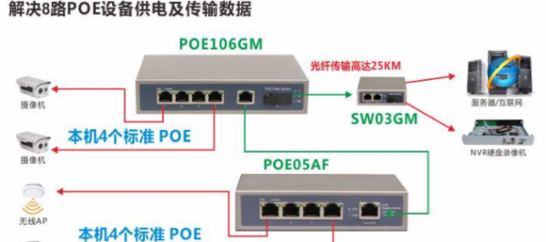 POE交换机不但可以实现普通交换机的数据传输功能还能同时对网络终端进行供电 。普通的交换机主要是交换数据的功能,并没有具备供电的功能。现在的网络高清摄像机基本都用POE交换机来供电,不需要像普通交换机一样进行电源布线,并且可靠度更高。
