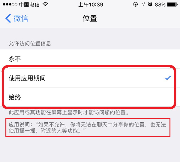 4、将位置设置成【使用应用期间】或者【始终】即可,可以看到官方说明如果不开启此功能附近的人将无法使用。