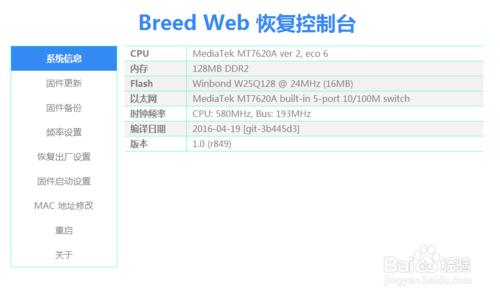 接着我们用硬物顶住mini的reset键插上电源开机,等到mini的灯狂闪的时候,松开reset键,打开浏览器登录192.168.1.1就可以进入Breed的web界面了,外观跟uboot的基本一致的。