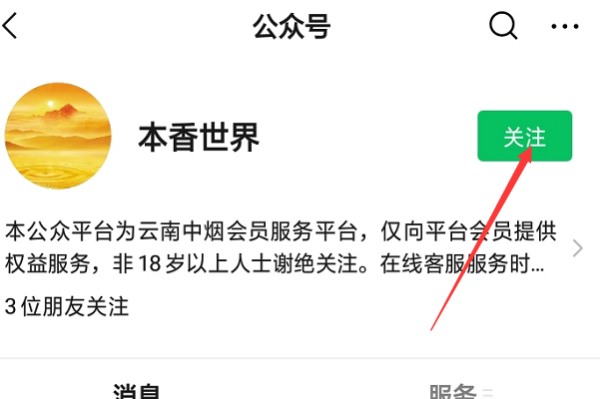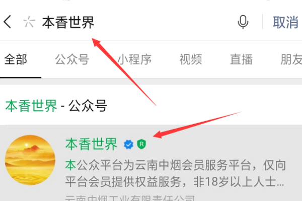 2、在出现的搜索框中输入本香世界,找到其微信公众号以后点击进入。