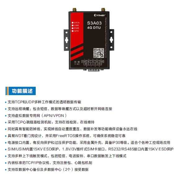 DTU是无线数据传输终端的英文简称,其采用2G、3G手机网络进行远程数据传输的。目前生产厂家众多。如何评价一台DTU是否好用呢?主要是看他的稳定性,功能性是否强大,以及其技术服务支持力度。 厦门,为,那公司在多年从业经验中最新研发的DTU有以下几个功能: 1、通过端子接口可以接RS485、422、233数据,接口丰富。同时还可以接模拟量采集,做逻辑控制。使用非常方便灵活。 2、当DTU出现参数故障或者需要修改参数时,不需到现场或者到中心服务器上修改。可以通过短信方式远程修改。这个功能实际工作中非常重要。 3、当中心服务器出现故障时,可以给备份中心服务器发送数据。更可以直接给指定手机发送数据。确现在,那几做DTU比较好