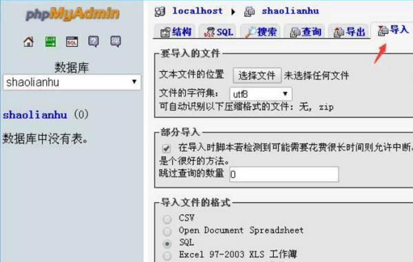 6、找到刚才创建的数据库,选择导入,再点击选择文件,最后点击右下角的执行