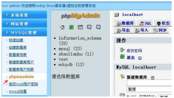 4、登录WDCP控制面板后台,找到左边的mysql管理的phpmyadmin点击一下