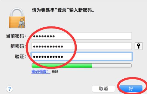 4、然后返回上级页面点击“更改钥匙串登录的密码”,将之前的登录密码更改掉,点击“好”完成设置。