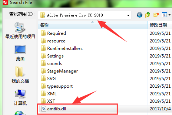 5、此时会弹出一个打开文件的对话框,在此对话框中要找到AdobePremiereProCC2018安装目录里的"amtlib"文件。选择该文件后单击打开按钮即可。