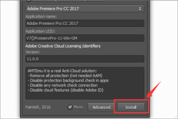 4、确定选择好“AdobePremiereProCC2017”后,然后点击install按钮。