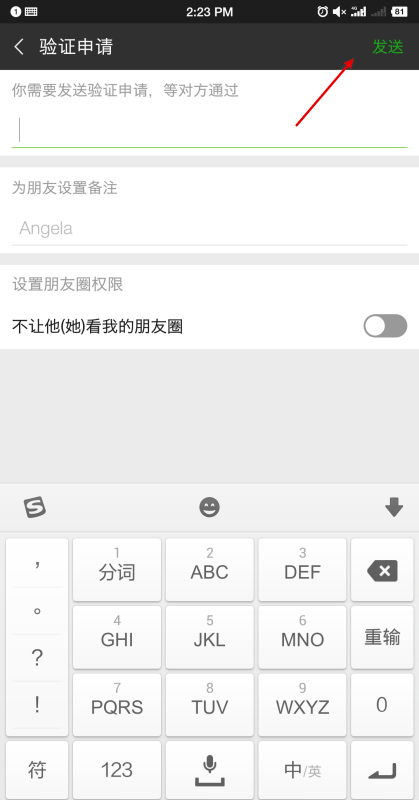 5.在验证申请页面中输入备注等相关信息,点击右上方发送,等待对方同意即可完成添加好友,如下图所示。